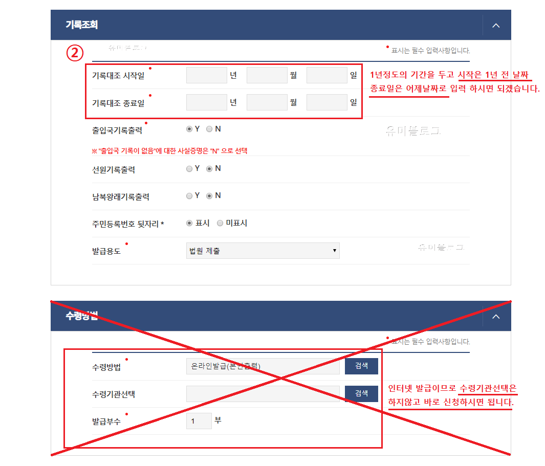 3. 기록대조 시작일, 기록대조 종료일을 1년 기간의 차이로 기재하며 기록대조 종료일은 어제날짜로 입력합니다.
